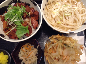 鶏肉を甘辛く煮た具がのった丼とうどん、桜エビのかき揚げがセットになった定食が1,000円ほどだったので、注文。