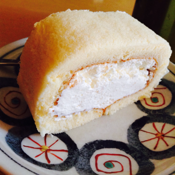 カステラが意外にもちっとしていて、ロールケーキのイメージでかぶりつくと「あれ?」という感じになる、不思議なケーキだ。