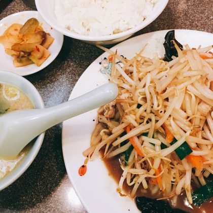 野菜炒めとセットのライス、味噌汁、ザーサイ。
