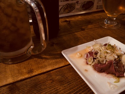 黒ホッピーと新レバ刺し。