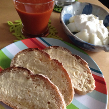 自家製全粒粉のカンパーニュにはバター1/3、カゴメの野菜1日これ1杯、リンゴとヨーグルトで朝食です。