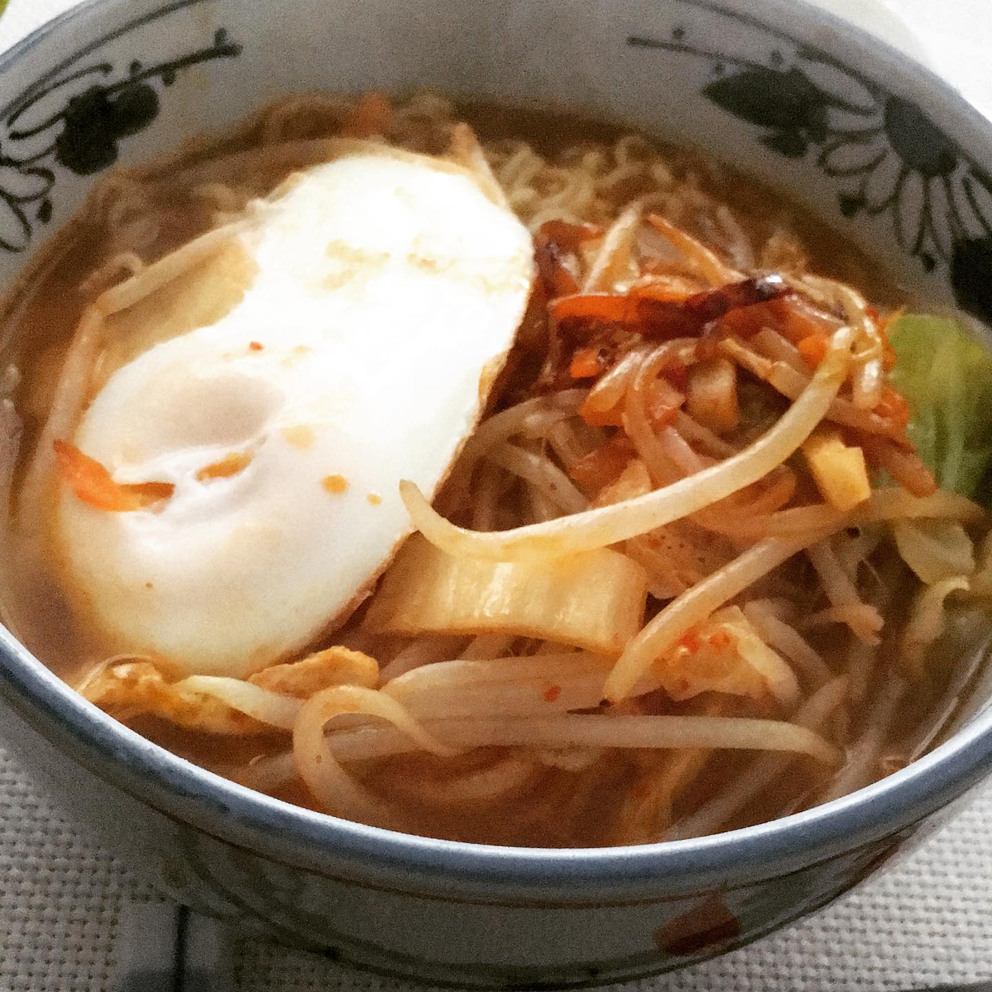#昼ごはん #家ラーメン #味噌ラーメン #袋麺 トップバリューの袋麺でおひるを作りました。上には、炒め野菜のパックを炒めて、目玉焼きを一緒に焼いておいたもの。キムチを加えてアクセントにしました。トップバリューの味噌ラーメン袋麺はクセのない味噌で、トッピングとも合わせやすいですね。