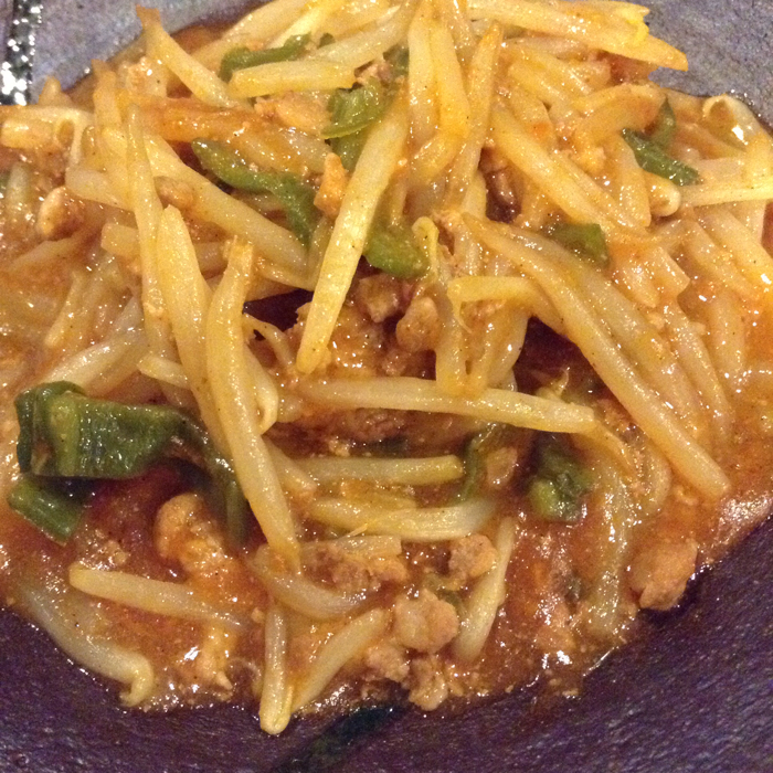 麻婆モヤシ。市販のソースを使ったものだが、なんとなく物足りない気がしながら最後まで飽きずに食べられるというのは美味しいということなのか?