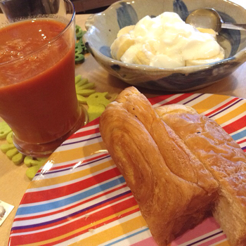 これから旅なので、ちょっと早い朝食です。缶deボローニャ、カゴメの野菜1日これ1杯、バナナとヨーグルト。