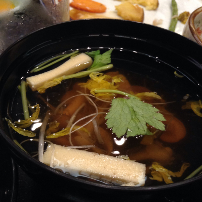 ご飯にと出てきたお椀。キノコ汁で、浮いているのは凍み豆腐。