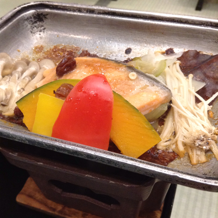 陶板焼きのような器で鮭のホイル焼きの中身を焼きながらいただくことができる。