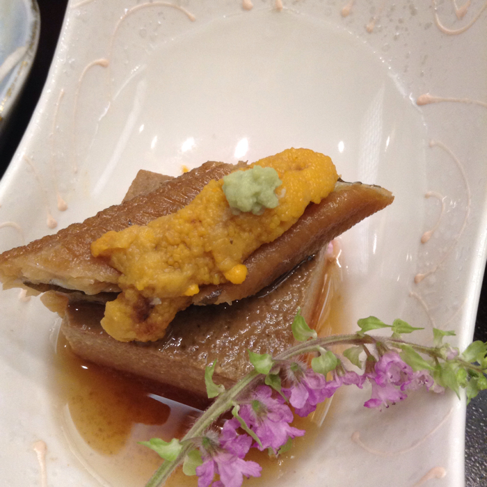 上から雲丹、穴子煮、ナッツ系の煮こごりのような豆腐、というおもしろいひと品。