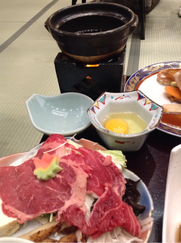 すき焼き鍋に火を入れてもらい、野菜と肉を投入してしばらくするとすき焼き風の煮物の出来上がりという寸法。