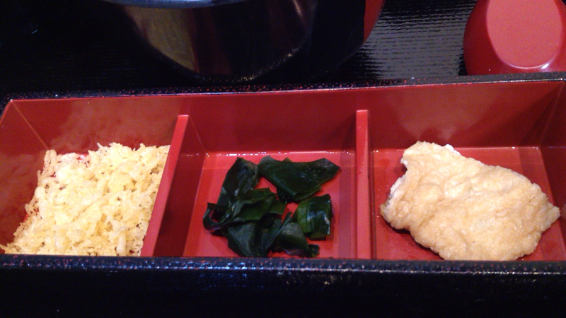 蕎麦にはネギのほかにこんなトッピングが付いてきた。揚げ玉、ワカメ、揚げ。かけそばに入れていただくという寸法だ。
