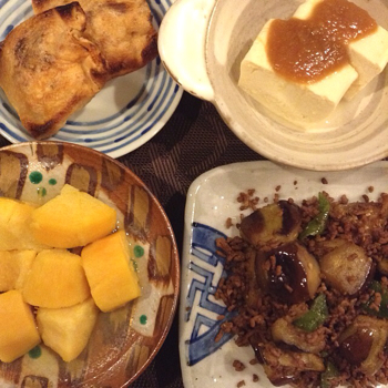 晩ツマは、茄子とピーマンとひき肉の五香粉炒め、安納芋のレモン煮、キムチの袋焼き。豆腐の田楽味噌です…