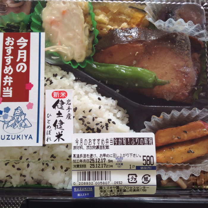 17 12月 12/17の昼弁 昼は、磯子駅前のスズキヤで買って来た弁当です。1人で食べるんじゃなくてカミさんと分けますので念のため(^.^) ボク用に選んでくれたのは、ブリの照り焼き弁当。 ご飯が銘柄米なのでちょっとお高め。 中身はバランスよくいろいろ入っている。 カミさんが選んだのはいわゆる助六。 赤飯のおにぎりが入っていても助六と呼べるのかどうかは不明(笑)。 お稲荷さんは味が濃い横浜仕立て。 ボクならこれに揚げ物などを足さないと物足りないだろうな。 タニタの味噌汁を作って添えてくれた。 マルコメ お徳用 タニタ監修減塩みそ汁 75g×7個 posted with カエレバ マルコメ 2013-09-02 Amazonで検索 楽天市場で検索 Yahooショッピングで検索 ヤフオク!で検索 7netで検索 ベルメゾンで検索 セシールで検索 価格.comで検索 共有:FacebookX ◆関連記事(こちらの記事も読んでみてください) 10/19の昼丼 7/23の昼ごはんはスパ弁 10/13の晩酌 9/29の昼カレー 投稿者: tori_ichi