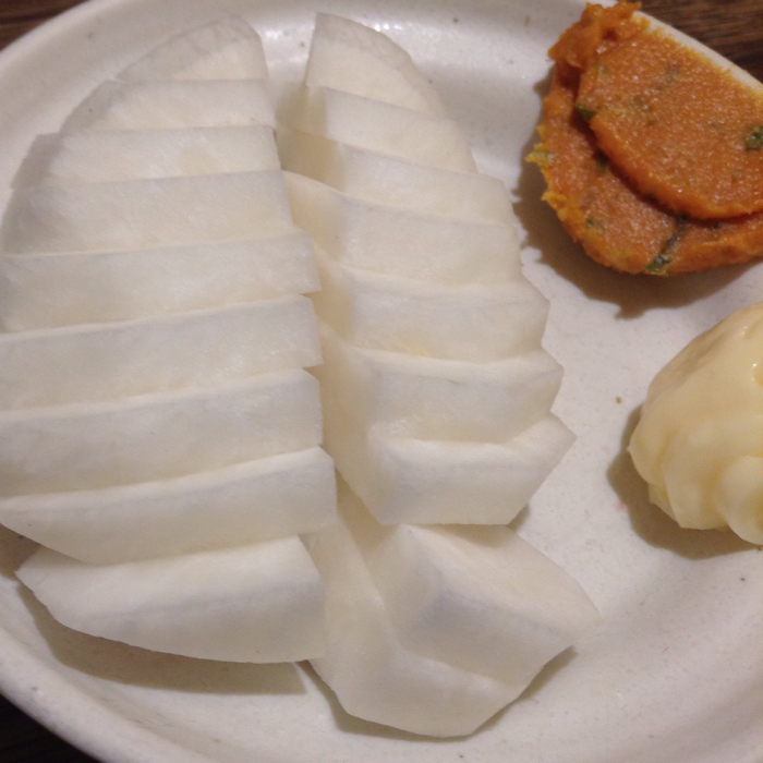 汁物が重なったけど、食べたかったのでもつ煮込みもたのんだ。主なところはシロとガツとスジ、あとはよく煮込まれた大振りのダイコンが入っていて、これがまたたまらん!