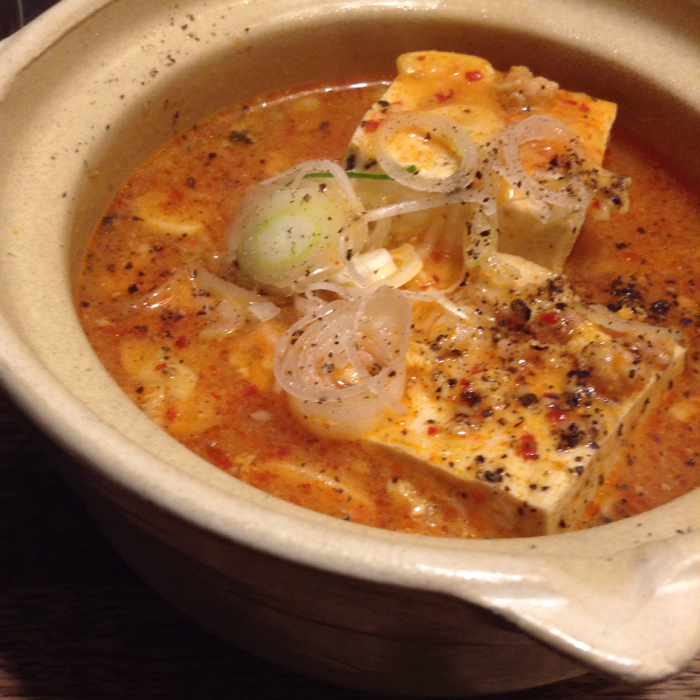 湯豆腐が最初に来た。湯豆腐と言っても坦々味なのだ。最初に豆腐をグズグズに崩して、スプーンですくいながらいただく。旨し。