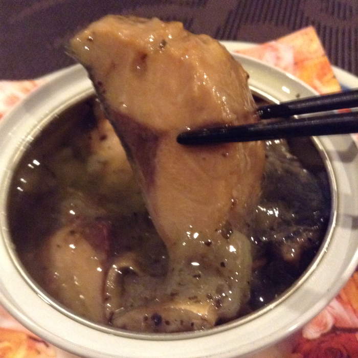 こんな切り身が入ってた。コンフィのような感じで仕上がっているので、いままでのサバ缶のイメージとは違っておもしろい。