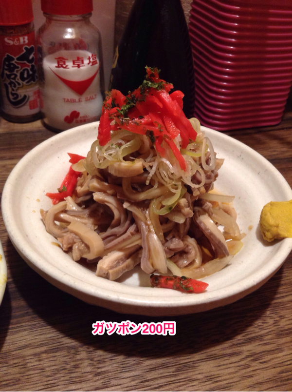 豚の胃袋を湯がいたものにポン酢をかけていただくメニュー。ポン酢にカラシをといて、紅ショウガやネギを混ぜ込んでからワシワシと頬張ると酒が欲しくなる。って、飲んでるけど(笑)。