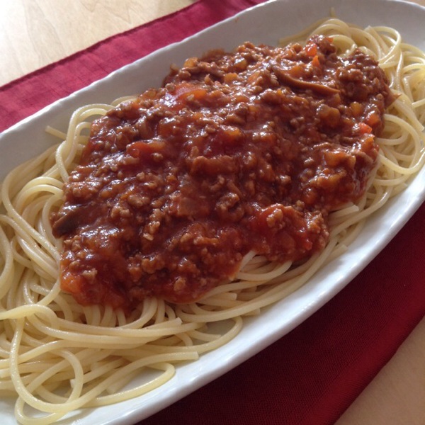 ひき肉足したミートソースパスタです。