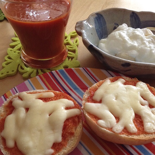 自家製全粒粉パンをピザ風に、カゴメの野菜1日これ1杯、バナナにヨーグルトで朝食です。