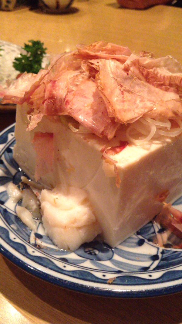 ご常連が皆さん注文している湯豆腐。手前に鱈がひとかけら。上に盛られた鰹節もじょうしつで、これだけ醤油に浸してチビチビといつまでも飲み続けられそうだ(笑)。