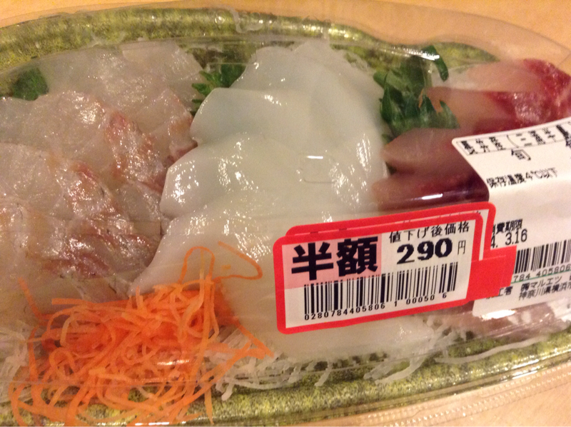 刺身は半額。日曜ということもあって、売り出しの商品だったのでしょうね。