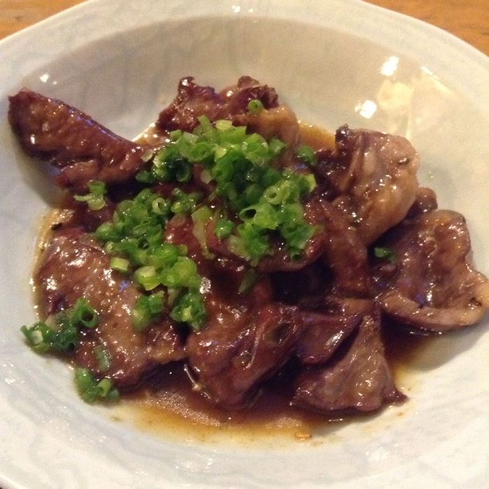 鶏ハツの味噌炒め。辛い味噌がいい具合。
