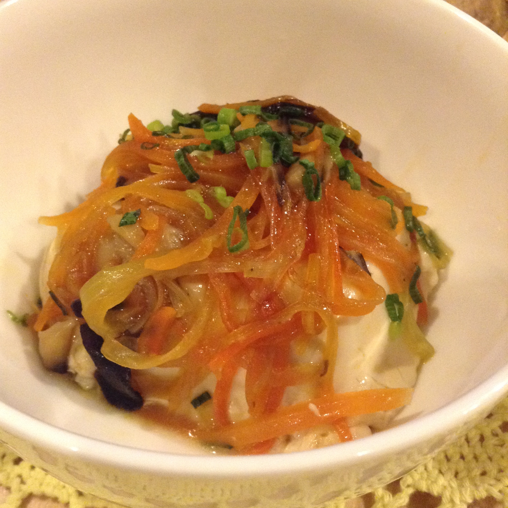 豆腐の上に野菜の餡掛けのようなものがのっています。
