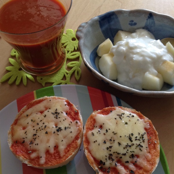 自家製全粒粉パンをピザ風に、カゴメの野菜1日これ1杯、リンゴにヨーグルトで朝食です。