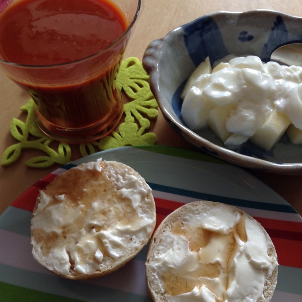 自家製全粒粉パンにクリームチーズとメープルシロップ、カゴメの野菜1日これ1杯、リンゴにヨーグルトで朝食です。