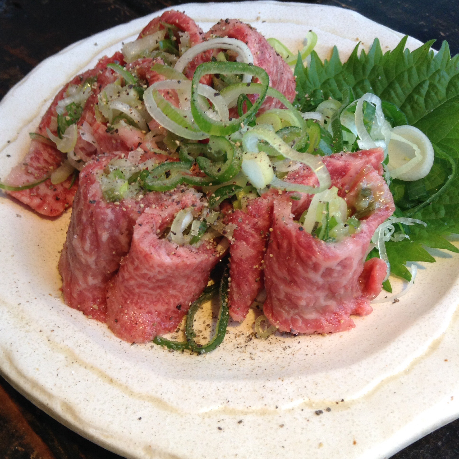 牛肉のワサビ巻き。牛刺しで山ワサビを巻いた一品。