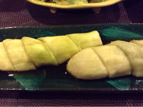 蒸しナスの柚子胡椒ポン酢。ちょっと柚子胡椒の風味が薄かったけど、サッパリして旨し。