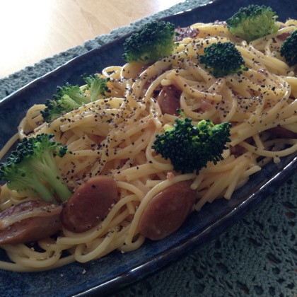 昼はカルボナーラソースのパスタ。
