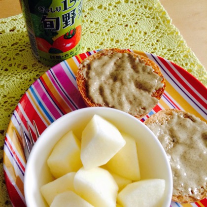 朝は、自家製全粒粉パンに黒豆きな粉クリーム。野菜ジュース。リンゴ王林。