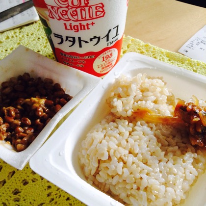 昼は、チョンガー飯。発芽玄米パックごはん、納豆、カップヌードルラタトゥイユ。