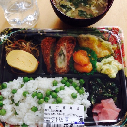 駅前のスズキヤをのぞいてみると、豆ごはんの弁当なる珍しいメニューがあったので、ゲット。天野フーズの野菜味噌汁を添えていただく。