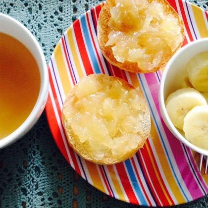 朝は、自家製全粒粉パンにリンゴジャム。タマネギスープカレー風味。バナナ。