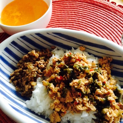 昼は、ガパオライスの素で作ったガパオライス。トムヤムスープ付き。