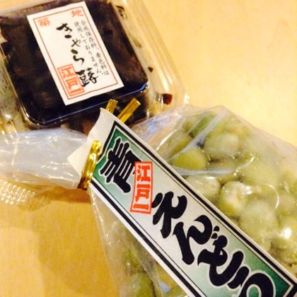 松坂屋ピーコックで買った茹でエンドウとキャラブキの佃煮。いずれも築地のお店のものとか。初めて見るブランドだけど、食べてみると雑味が少なくて美味しい。
