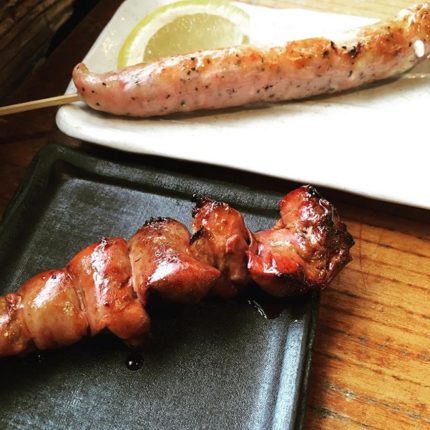 #横浜商店 極上レバー150円、バジルとチーズのソーセージ串220円。