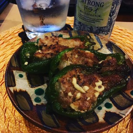 6/7の晩ごはん 肉詰めピーマン 鶏のひき肉で作ってみました。