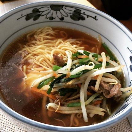 6/10の昼ごはん さっと炒めたパック野菜(モヤシとニラ)に豚肉をマルちゃん正麺の醤油味にトッピングしました。半熟玉子が汁の下に隠れています。