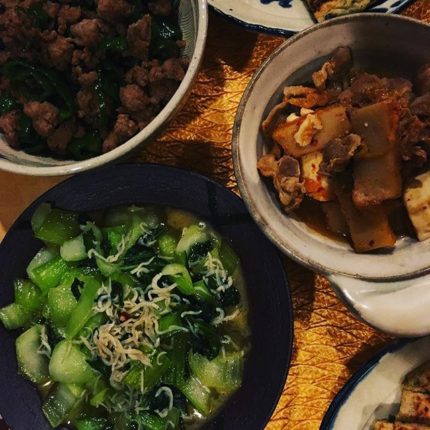 6/1の晩ごはんは、チンゲンサイと釜揚げしらすのシャンタン炒め、豚ひき肉とピーマンの醤油炒め、昨日の残りのキムチ鍋です。