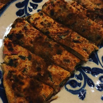久しぶりのヒラヤーチー。お好み焼き粉100g、水100cc、鶏卵1ヶ、ツナ缶1個、ニラ半束、紅生姜のみじん切り、すりごまを混ぜて、平たく焼くだけです。でもこれがウマいんだなあ。