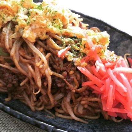 おひるは焼きそば。3玉97円の麺、1袋98円の炒め野菜パックで、2人分のソース焼きそばの出来上がり。和牛と黒豚の合い挽きも半額でゲットしました。うーん、お腹いっぱいだあ。