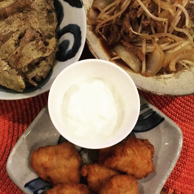 11/8の晩ごはんは、スーパーの惣菜売り場で買ってきたチキンナゲットをヨーグルトにんにくソースで、冷凍しておいたラム肉にタマネギとモヤシを合わせてジンギスカンのタレ炒め、残り物の牛肉とゴボウの煮物を卵とじに。