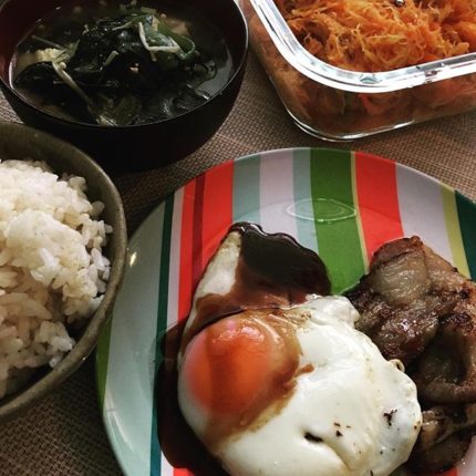 1/17の昼ごはんは、黒豚カルビを塩麹に漬けておいたものを焼いて、ベーコンエッグ風にしてみました。