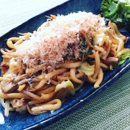 おひるは焼きうどんを作ってみました。バック野菜と余らしておいた肉を炒め、味付けは付属の醤油味。お皿に盛ってからこれまた付属のおかかをかけて出来上がりです。なかなかおいしかったですよ。