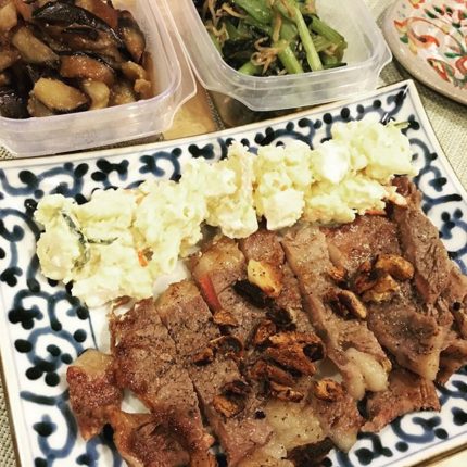 晩ごはん。スーパーに買い物に行くと、和牛ステーキ肉が半額!ナスは炒めてポン酢で味付け。小松菜も炒めてシラスを投入。ナスと小松菜は常備菜になりますね。