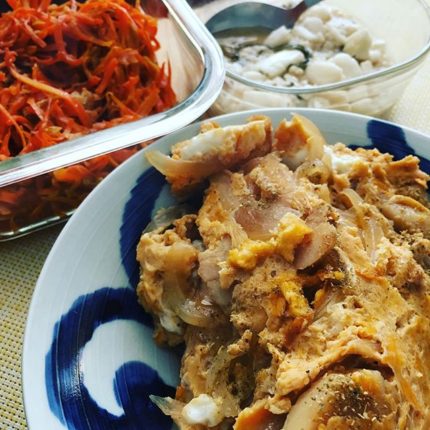 おひるは、冷凍のサラダチキンを使った親子煮。2人前だとちょっと多めだけど、めんつゆと日本酒を1対1で100ccならちょうどいい塩梅になります。左は夕べつくっておいたニンジンしりしり。右は、長芋の漬けただけ。
